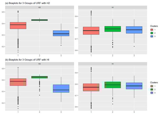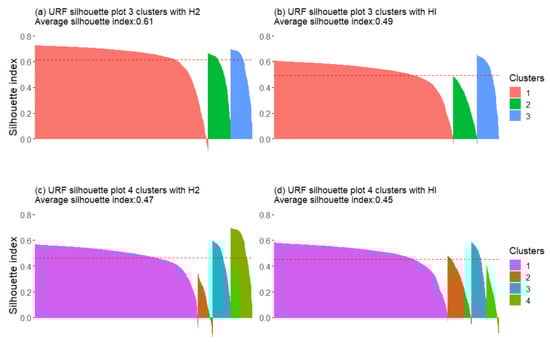 The URF has more variables that affect the results: the number of trees (nt) and several variables (m) used for splitting branches. Three or four clusters were used and H2, HI, and no Hurst exponent analyses, were calculated. For each combination, URF was calculated for different nt and m to obtain the analysis with the highest Silhouette Index (Figure A4, Figure A5 and Figure A6). Compared with k-means, URF showed higher variability between the results, whether using H2, HI, or no Hurst exponent. The silhouette values from URF were consistently higher when three groups were used for the three analyses regarding the Hurst exponent (Table 1). When four clusters were used in our analyses, the additional fourth cluster showed a low Silhouette Index for that cluster (Figure 6). Therefore, only the URF clustering for three clusters will be discussed with and without the Hurst exponents, focusing on the cluster with the highest Silhouette Index (H2).