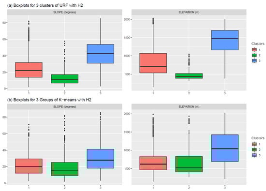 Slope and elevation comparison for all clusters when URF (a) and k-means (b) were used with H2 in all study areas.