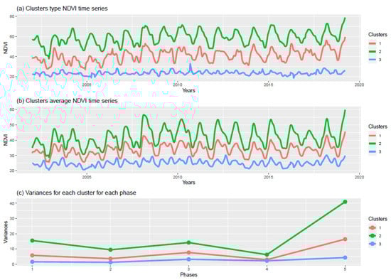 Time series of cluster prototypical pixels in: (a) the cluster type (selected based on their vegetation type: mixed shrubland for cluster 1, open woodland for cluster 2 and grassland for cluster 3); (b) the average of each cluster; and (c) the variances for each cluster and phase, based on the NDVI dynamics following [].