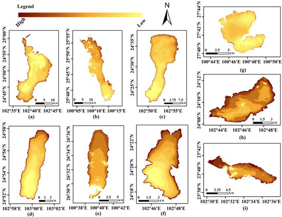- The lakes with chlorophyll-a concentrations of less than 0.03 mg/L were Chenghai Lake, Yangzong Lake, Erhai Lake, Fuxian Lake and Lugu Lake, among which the chlorophyll-a concentrations of Erhai Lake, Fuxian Lake and Lugu Lake were less than 0.01 mg/L. The lakes with chlorophyll-a concentrations between 0.03 and 0.1 mg/L were Dianchi Lake and Xingyun Lake. The average value of the chlorophyll-a concentration in the northeast of Dianchi Lake and the north of Xingyun Lake was 0.085 mg/L. The lakes with chlorophyll-a concentrations greater than 0.1 mg/L were Yilong Lake and Qilu Lake, among which the chlorophyll-a concentration in Qilu Lake was greater than 0.14 mg/L.