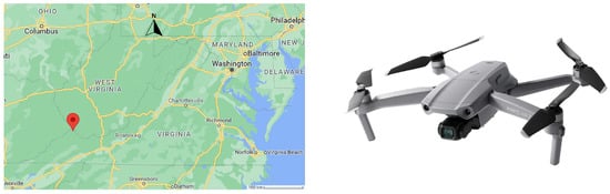 In order to collect imagery of the test area after the flood damage, two visits were made to Hurley: one in November 2021 and the second in April 2022. During our two visits to the flood site in Hurley, a DJI Mavic Air 2 drone was used for collecting aerial imagery. The left portion of Figure 1 shows a map of Virginia and surrounding states with the location of Hurley marked by a pin. The right portion of the figure shows a picture of a DJI Mavic Air 2 drone, which was the model of drone used for our data collection. Flights were performed at an altitude of 50 m with the camera set to capture 12 megapixel nadir imagery. During the first visit in November, six flights were flown to collect imagery over the flooded areas. Five additional flights were flown along the same stretch of road during the second visit to the area in April.