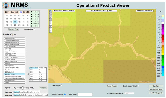 Rainfall data was acquired from the NOAA National Severe Storms Library (NSSL) Multi-Radar/Multi-Sensor System (MRMS) [21]. “The Multiple Radar Multiple Sensor system combines data streams from multiple radars, satellites, surface observations, upper air observations, lightning reports, rain gauges and numerical weather prediction models to produce a suite of decision-support products every two minutes” [22]. Rainfall data is available in Radar only and Multi-Sensor QPE (Quantitative precipitation estimation). Radar only QPE values are precipitation accumulations derived from the summation of the Surface Precipitation Rate (SPR) product over specific time intervals [23]. Multi-sensor QPE uses a combination of gauges and Numerical Weather Prediction (NWP) Quantitative Precipitation Forecasts (QPF) to fill in gaps in poor radar coverage areas [24]. The Multi-sensor QPE values were used as the precipitation for our simulations since this should be more accurate than radar only data. The Multi-sensor QPE data is available at 1 h intervals, so this interval was selected for our simulations. An example of the product viewer containing precipitation data is shown in Figure 3.