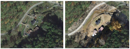 Figure 6 and Figure 7 show comparisons of satellite imagery from before the flood event to the orthophotos created from the aerial imagery collected with our drone. These two comparisons were selected to highlight some of the damage which occurred in this area during the flooding. In Figure 6, the stream has become much wider in this portion due to a noticeable amount of erosion to the land around the stream. Additionally, the bridges from the road to the homes were destroyed and washed away during the flooding, while the buildings in this area were not destroyed or washed away, the flooding had an observable impact on the terrain surrounding these buildings. Figure 7 shows an example of a location where homes were completely destroyed during the flood. Changes to the stream size in this area are not as dramatic, but multiple buildings and many trees in this area were wiped out.