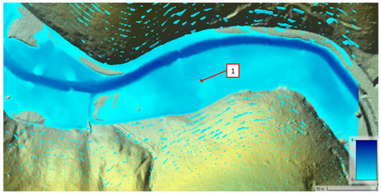 HEC-RAS simulated water depth values using a post-flood environment Digital Elevation Model. The ground-truth measurement location is marked with the label ’1’. This is the same area as the simulation in Figure 9.