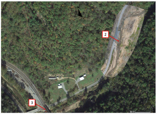 The test area used for this work was a portion of Guesses Fork Road in Hurley, Virginia. Hurley is a small community in Southwest Virginia very near to the Kentucky and West Virginia state lines. On 30 August 2021, heavy rainfall caused significant flooding, landslides, and mudslides in Hurley. This resulted in the destruction of over 20 homes and led to death of one person [14]. The flooding in this area occurred rapidly in a short time frame, with water rising up and in people’s homes in less than 30 min [15]. Rainfall estimates varied around the area, but over six inches of rain was estimated to have fallen along portions of Guesses Fork Road [16]. Within the first two days of emergency response, emergency personnel estimated they had conducted between 40 and 50 evacuations [17]. In the immediate aftermath of the flooding, officials estimated that it could take a month before electricity was restored and a year before water service would be restored in the affected communities [18]. Despite the devastation in the area, the Federal Emergency Management Agency (FEMA) denied the request of Individual Assistance to those impacted by the flooding [14]. This further highlights the necessity of the development of rapid assessment techniques which can quantify the magnitude and likely recurrence of natural disasters.