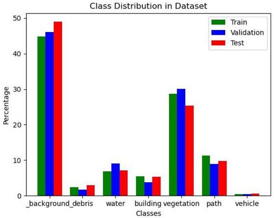 We have created a dataset of 135 images having resolution and annotated these for semantic and instance segmentation using 6 classes: debris, water, building, vegetation, path, and vehicles. Figure 13 shows the pixel distribution for each class in the Hurley dataset. The dataset is split into training, testing, and validation with each category having 75%, 15%, and 10% of images, respectively.