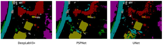 Semantic segmentation results comparison of DeepLabV3+, PSPNet and UNet.