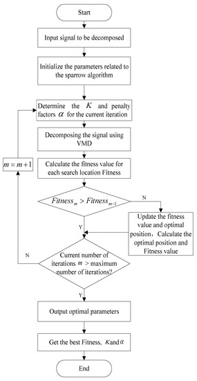 - VMD of the signal and calculation of the initial fitness of each sparrow are next. Based on the optimization principle of the sparrow algorithm, the minimum fitness value is selected by updating the positions of the discoverer, the follower, and the position of the sparrow that is aware of the danger while continuously comparing the fitness values of each position.