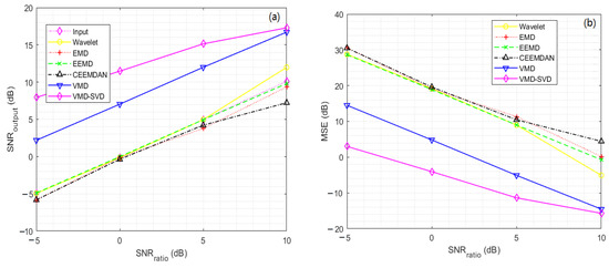 Table 5 lists the SNRs and MSEs of Figure 11. It is clear that the VMD-SSA-SVD method outperforms the other four in terms of both SNRs and MSEs.