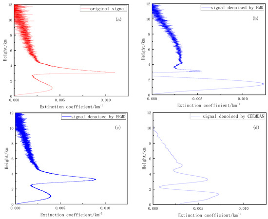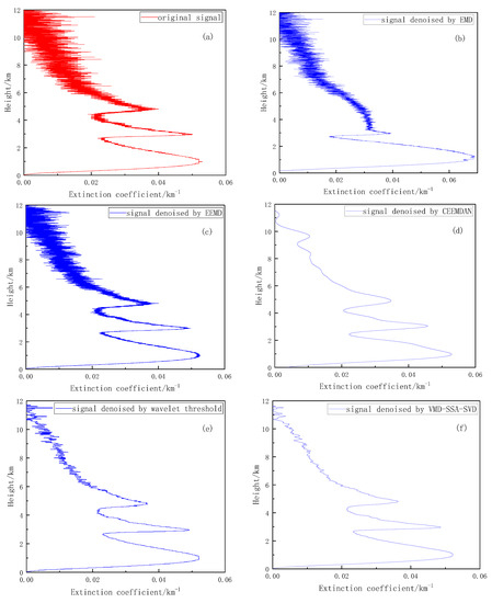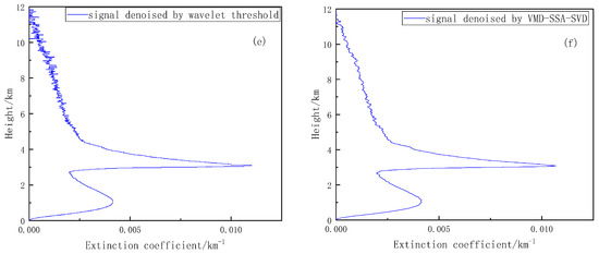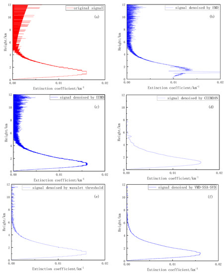 To further verify the denoising effect of the VMD-SSA-SVD algorithm on the complex return signal, we used the return signal containing one cloud layer. Figure 10 shows the profiles of the extinction coefficient inverted from the return signal containing one layer of obvious clouds. There is an obvious cloud layer between 3 km and 4 km, in which the distribution of the extinction coefficient is smooth. At approximately 5 km, the signal intensity and SNR decrease due to the attenuation of the laser beam energy, the trend of the extinction coefficient becomes increasingly blurred, and the useful signal is almost completely submerged in the noise. Figure 10b shows the extinction coefficient profile denoised by the EMD method, and the signal is not only severely distorted but also has abnormal mutation at 3 km. Figure 10c shows the extinction coefficient profile denoised by the EEMD method. The noise is hardly filtered out, especially at the peak of the extinction coefficient of the cloud layer, and the value of the extinction coefficient has a large distortion compared with the unprocessed value. Figure 10d shows the extinction coefficient profile obtained by the CEEMD method. Although the curve is very smooth, the signal is lost after 10 km, the distortion is very serious, and even if there are some abrupt changes, the noise elimination effect is far inferior. Figure 10e shows the extinction coefficient profile denoised by the wavelet packet method. Its noise-elimination effect and signal fidelity are relatively better than those above. Figure 10f shows the extinction coefficient profile processed by the VMD-SSA-SVD method. It is clear that it retains the details of the intact signal, can effectively identify the changing characteristics of the extinction coefficient, and does not lose the spatial resolution and signal fidelity to obtain the noise-elimination effect.
