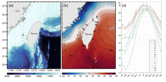 (a) The study area and the long-term average ocean geostrophic currents from July 2015 to May 2022, (b) the long-term average SST derived by the Himawari-8 satellite from August 2015 to April 2022, and (c) the climatological monthly average SST from the Himawari-8 satellite at each station in Figure 1b from August 2015 to April 2022.