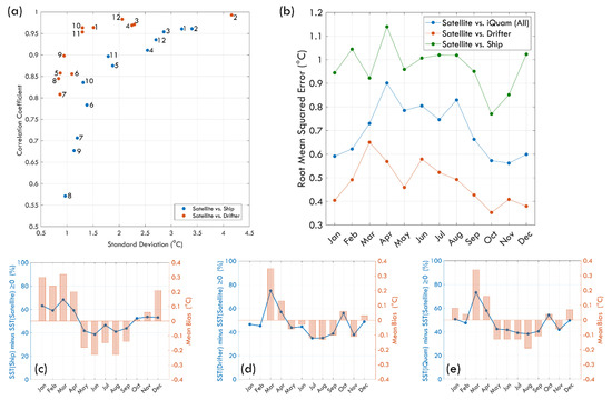 Figure 3a presents the correlation coefficient between the bulk and skin SST in each month, as well as the standard deviation (STD) of the ship and drifter data, to understand the difference in the monthly average spatial distribution scale. The monthly STD range of the ship SST was between 0.97 °C (August) and 3.40 °C (February), while the STD range of the drifter SST was between 0.84 °C (August) and 4.16 °C (February). Except for February, the STD of the ship SST was larger than the drifter SST each month, which may be due to SST measurements from commercial ships being much less accurate than those from drifters. Under the long-term scale and wide spatial range, the relation between ship bulk SST and skin SST was highly correlated with correlation coefficients, 0.9509 (ship) and 0.9901 (drifter); however, the root mean squared errors (RMSEs) of the two bulk SST dataset and skin SST dataset were quite different (ship: 0.9649 °C; drifter: 0.4924 °C). The mean bias were similar (Figure 3c–e), which were 0.03 ± 0.96 °C (ship) and 0.03 ± 0.49 °C (drifter). These results show that the difference between ship bulk SST and skin SST was much larger than that of drifter bulk SST, but the ratio of bulk SST minus skin SST greater than zero was almost the same (ship: 52%, drifter: 49%), resulting in the mean bias of the two being close. The maximum and minimum biases of ship bulk SST and skin SST were 3.64 °C and −4.95 °C, respectively, while those of drifter bulk SST were 3.15 °C and −2.92 °C, respectively.