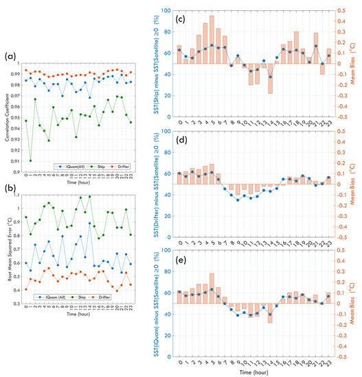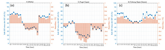 The bias between bulk and skin SST has seasonal variation, which cannot be found if only the RMSE results are considered (Figure 3b). The correlations of bulk and skin SST were highest in spring and gradually decreased in July and August. The bias also changed from positive values in winter to negative values in summer (Figure 3c–e). Such results show that the strong solar insolation in summer leads to a significant stratification of the near-surface ocean, making the average bulk SST lower than the skin SST. In March, the wind speed in the ocean adjacent to Taiwan is weak, and the solar radiation is not as high as that in summer. Currently, the well-mixed near-surface ocean layer causes the average bulk SST to be slightly higher than the skin SST. The time series comparison of bulk and skin SST at the local time is shown in Figure 4. The high correlation represents the consistency of data within the hour (Figure 4a). As a result of the monthly timescale, the drifter SST and skin SST are closer than the ship SST and skin SST, and the daily variation is still not visible from the RMSE results (Figure 4b). However, the mean bias results show significant diurnal variation. During the daytime, especially near noon, the sea surface is affected by solar insolation and absorbs heat energy so the average bulk SST was lower than the skin SST. During the daytime, the mean bias of the ship SST was −0.13 °C and the drifter SST was −0.06 °C. The cool skin layer appears obviously at night, and the average bulk SST was higher than the skin SST. At night, the mean bias of ship SST was 0.20 °C and the drifter was 0.10 °C. The bias was greatest between four and five o’clock in the morning before the sun rose.