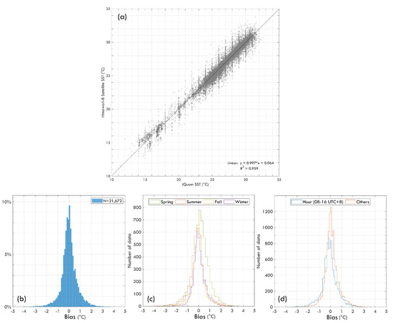 (a) Comparison of SST data between the iQuam and Himawari-8 satellite, and the histogram of bias for bulk-skin SST data pairs (b) for all samples, (c) in four seasons, and (d) during daytime and nighttime. A positive value of bias indicates that bulk SST (iQuam) is greater than skin SST (satellite).