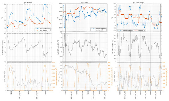Time series variations of bulk and skin SST in (a) Hsinchu, (b) Chimi, and (c) Xiao Liuqiu, and their corresponding solar shortwave radiation and wind speed.