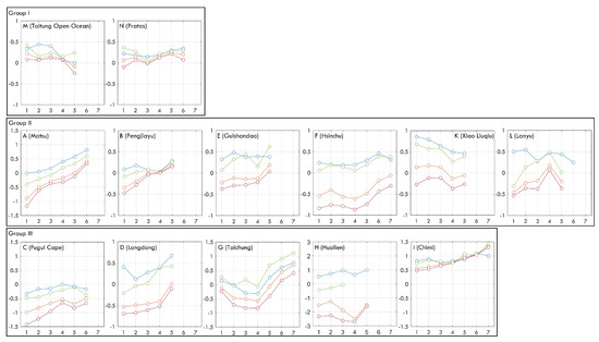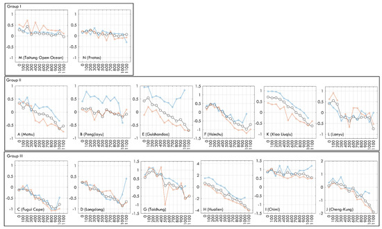 Different from the observed distributions of the random locations in the previous section, this section discusses the buoy data for 14 fixed sites (Figure 1b). Because each sea area has different ocean stratification conditions and hydrological characteristics, the variables affecting the near-surface temperature gradient can be controlled using fixed location sites. In general, RMSE results are used to evaluate the difference between the two SST sets. Figure 6a shows that the average RMSE of Groups I and II was less than 1 °C, and the RMSE of Group III was higher than 1 °C. Group III, which is close to the shore, could have been affected by river discharge, resulting in larger changes in SST. However, a difference in the near-surface temperature could not be found in the RMSE results. From the correlation between bulk and skin SST in each month (Figure 6b), it was found that the SST change at each buoy in the same month was large and inconsistent, which is the same as the results in Figure 3a. The mean bias value change of each buoy on a monthly timescale is shown in Figure A1. Figure 4 shows that the mean bias value change of the ship and the drifter on a daily scale was a typical skin effect. However, according to the 14 buoys, it seems that there was no obvious skin effect in the long-term average statistical results of some locations. Figure 7a shows the typical cool skin layer produced by the well-mixed near-surface layer at night and the DWL produced by the solar insolation during the daytime. In addition to A (Matsu), Buoys B, D, E, F, G, H, K, and L all had the same diurnal variation characteristics of mean bias. Figure 7b shows that even at nighttime, most of the bulk SST data were lower than the skin SST data, and the SST bias was even larger near noon. In addition to B (Fugui Cape), J (Cheng-Kung) also had such characteristics. Figure 7c shows that even in the daytime, the SST bias was still not quite different (Buoys M and N), and I (Chimi) even observed that the bulk SST was higher than the skin SST by more than 0.6 °C on average, no matter the time.