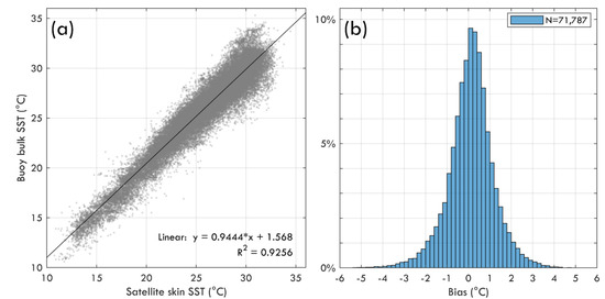 (a) Comparison of SST data between buoys and the Himawari-8 satellite and (b) the histogram of bias for bulk-skin SST data pairs (b) for all samples.