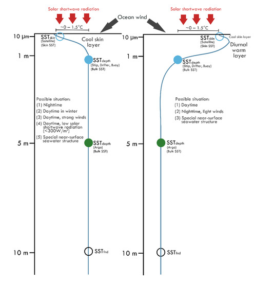 The observation of sea surface temperature (SST) is necessary and important for the study of the global ocean heat budget and air-sea interaction. SST observed by satellite infrared radiometers is called skin SST, which characterized the temperature of the upper ~10 µm ocean layer, while SST observed at a certain depths in the near-surface, such as 1 m, 2 m or 5 m, is called bulk SST [1]. The main error sources of satellite measurements of SST are caused by dust, water vapor, clouds, the instrument, and skin effects [2]. In the case of low wind speed, the vertical and horizontal structures of skin and bulk SST vary greatly with time [3,4,5]. The SST bias between the skin and bulk SST is approximately 1 °C, but the bias may reach 3 °C due to different sampling depths [6]. The analysis and accurate calculation of the interaction between the skin effect and air-sea interaction is important [7], and wind can cause near-surface layer stratification [8]. At the global scale, the average cool skin effect observed by the ENVISAT satellite, drifting buoys and moorings is 0.13 °C [9]. In the waters near Australia, the average bias between skin SST and 7–9 m of bulk SST was 0.23 °C [10]. In the South China Sea, a range of 0–1 °C accounts for 95% of the SST bias, and the value most often appears in a range of 0.4–0.6 °C [11].