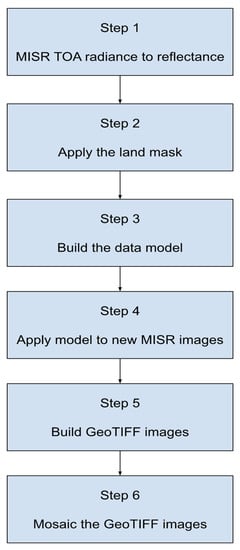We began with downloading concurrent and co-located ATM and MISR data. ATM ICESSN roughness data [42] were downloaded from the National Snow and Ice Data Center. MISR Level 1B2 top-of-atmosphere (TOA) radiance data (ML1B2E) were downloaded from the Langley Atmospheric Science Research Center. As previously mentioned the ML1B2E data are in Space Oblique Mercator Projection (SOM) and each 16-day orbital repeat period has 233 paths; each path is composed of 180 blocks. Blocks are spatially offset to accommodate the curvature of each path. We note that standard HDF-EOS processing routines do not assemble the blocks into smoothly contiguous images. In the next step, we converted TOA radiance to TOA reflectance. Reflectance characterizes the roughness of a surface independent of the magnitude of solar illumination. Each MISR HDF file includes all the blocks in a single MISR path which nominally include 180 blocks. Therefore, we then extracted the number of blocks that cover our study area (blocks 1–46). We then applied a land mask to each block of the MISR data to exclude land areas.