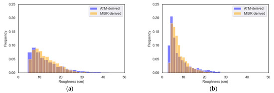 Histograms comparing MISR-estimated (using KNN model) and ATM-observed (independent test data) sea ice roughness for (a) April and (b) July 2016. The brown color is where the blue and orange colors overlay each other.