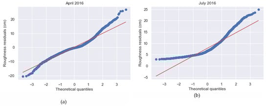 Q-Q plots for the April and July 2016 datasets (a,b) show the error distribution of MISR-estimated roughness for (a) April and (b) July 2016.