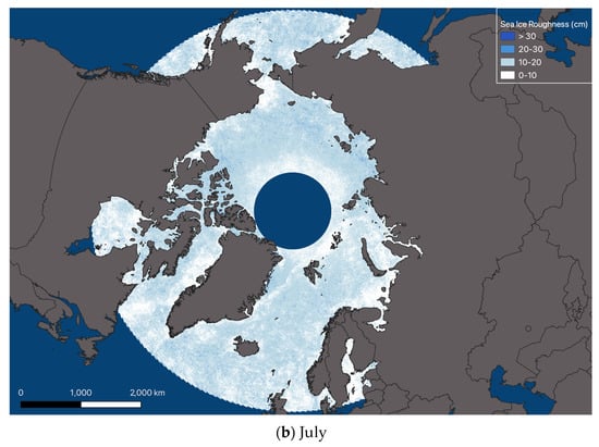 We also inspected some areas adjacent to the east coast of Greenland in our July roughness map. Figure 7 shows an arbitrary location at the Fram Strait in July 2016.
