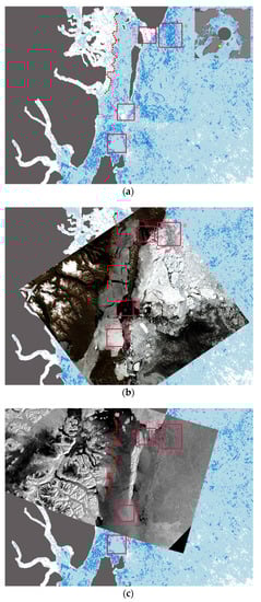 Comparison of (a) MISR-derived roughness map with (b) Landsat 8 and (c) Sentinel-1 images at an arbitrary location north of the Canadian Archipelago on 29 April 2016 at 116.1 W and 77.5 N.