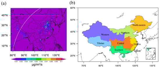 (a) Map of study domain and distributions of the mean BC emissions in March 2018, the full disk scanning of Himawari-8 over the study domain is shown in the white line. (b) The zoning map of seven main electricity grids in China.