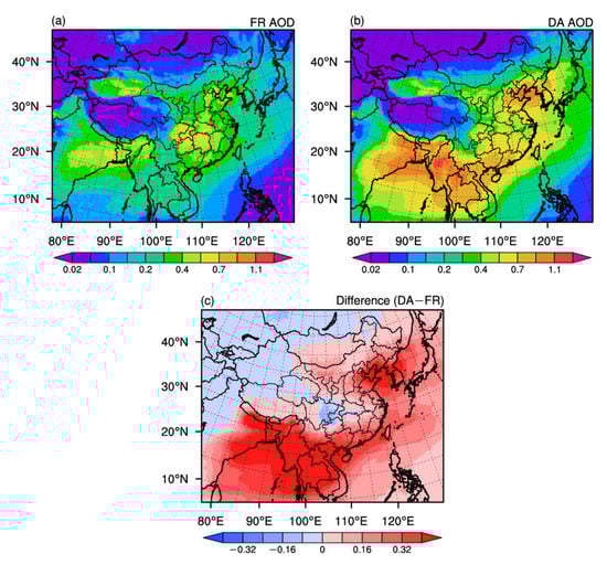 Due to the lack of aerosol simulation in OR experiment, only aerosol spatial column distributions in FR and DA experiments are analyzed here. Figure 2 shows the horizontal distributions of the simulated time-averaged AODs in the FR and DA experiments and their differences (DA experiment minus FR experiment). For the FR experiment, high AOD values are found in Xinjiang province, central China, and South Asia, where human activities are frequent. At the same time, low AOD values below 0.05 are found over the Tibetan Plateau and neighboring areas where anthropogenic aerosol emissions are limited. As shown in Figure 2b,c, after DA, it is apparent that DA enlarges the AOD values over the human-active areas except for Northwest China, part of Southwest China, and part of Central and North Asia. There are significantly increasing AODs in South Asia, Southeast Asia, the North China Plain (NCP), and the southwest and southeast coast of China on land, with average values passing 0.32. In the DA experiment, the range of low-value centers becomes smaller and moves northwest, while a low-to-high shift (from about 0.70 to nearly 1.1) can be found in areas in South and Southeast Asia (Figure 2b). Similar results have been detected by earlier studies [,], which reveal that the observed AODs higher than 0.7 are consistently examined over the heavily industrialized and densely populated regions of India, Bangladesh, and China in spring. The relatively non-obvious change (with an absolute value below 0.04) may result from the absence of observations of Himawari-8 to be assimilated over the west of 80°E, leading to a lack of assimilation data on the periphery of the measurement range.