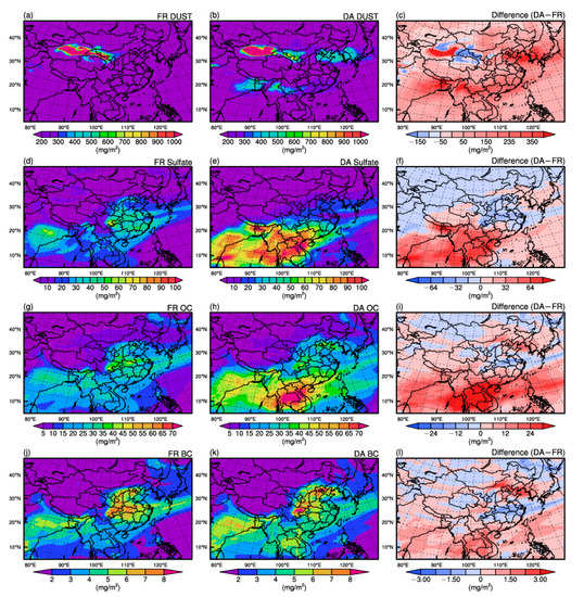 Spatial distributions of the daily mean values of the aerosol burdens for each component (including dust, sulfate, organic carbon [OC], and black carbon [BC]) in the FR (a,d,g,j) and DA (b,e,h,k) experiment and their differences (c, f,i,l) on 16 March 2021. The difference is defined as the result of the DA experiment minus that of the FR experiment.