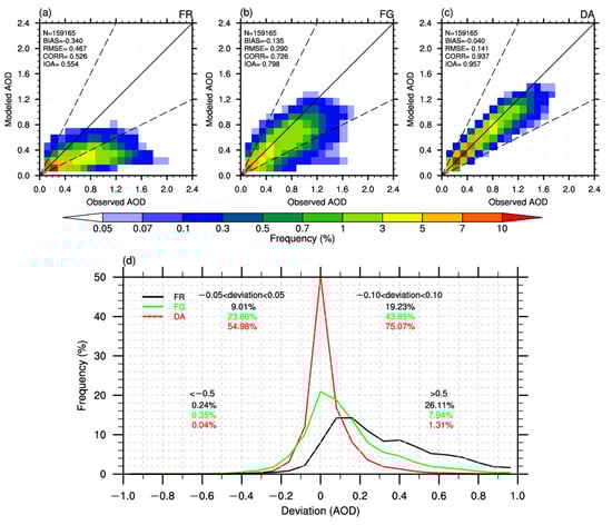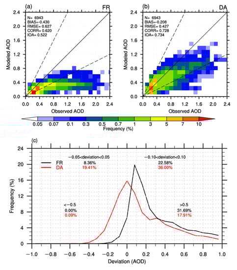 Figure 7a and b show the comparison of the probability density of the observed hourly AODs versus the ones from the simulated results with and without the assimilation. Compared to the independent observations, apparently, the simulated AODs in the FR experiment led to obvious underestimations (Figure 7a). AODs assimilation essentially reduced the tendency and is superior to those in the FR experiment as indicated by the BIAS, RMSE, CORR, and IOA values (Figure 7b). For example, the BIAS values are −0.430 in FR and −0.208 in DA; the latter reduces by about 51.62% compared to the former. The RMSE values show similar results. Meanwhile, the CORR and IOA values increase by about 61.29% and 40.61% compared to the FR experiment, indicating that the forecast fields are significantly improved by DA. Figure 7c shows the frequency distributions of AOD deviations. In the FR experiment, it reveals a positively bias, whereas in the DA experiment, the results not only show reduced bias but show a peak closer to 0. Compared with FR ones, about 36.00% of AOD deviations drop into the absolute departures less than 0.10 for the DA experiment, and 43.48% of AOD deviations are reduced in data dropping into the departures greater than 0.50. We also find that the DA is more efficient in correcting highly overrated AODs with departures greater than 0.50 compared with underestimated values with departures less than −0.50. Similar results have been observed during earlier works on assimilation AODs [,]. The above findings indicate that AOD assimilation can significantly improve the model performance.
