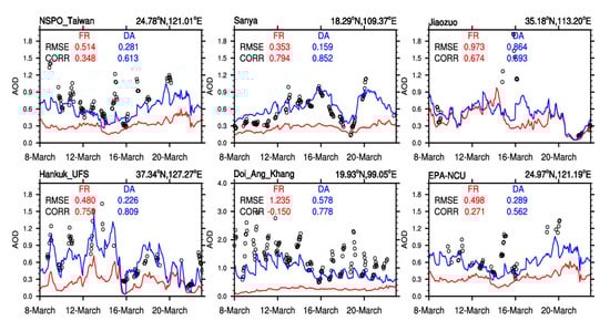 Compared with the observations, results in the FR experiment underestimates the AODs, especially in relatively high-value stations. Their large RMSE values of the FR experiments are significantly removed by the assimilation of the Himawari-8 AODs. For example, observed AODs in Sanya show obvious daily variations, especially on 16 March 2021. The high AODs on that day is successfully reproduced by the DA experiment, and it is consistent with the DA results in Figure 3. DA helps to decrease its RMSE by 54.95%. At Hankuk University (Hankuk_UFS station), the sudden increase of AODs on 16 March is also detected by the DA experiment. In Doi Ang Khang station, the observed AODs remain at relatively high values due to serious anthropogenic emissions in Southeast Asia on March, which is consistent with DA results in Figure 3. Its RMSE value reaches 1.235 in the FR experiment, with a poor CORR value of -0.150. A significant RMSE reduction and CORR elevation can be found by DA, with relative improvement up to 53.20% for RMSE. All in all, with higher CORR values, all the stations correctly modify the AODs variations to match the observations better.