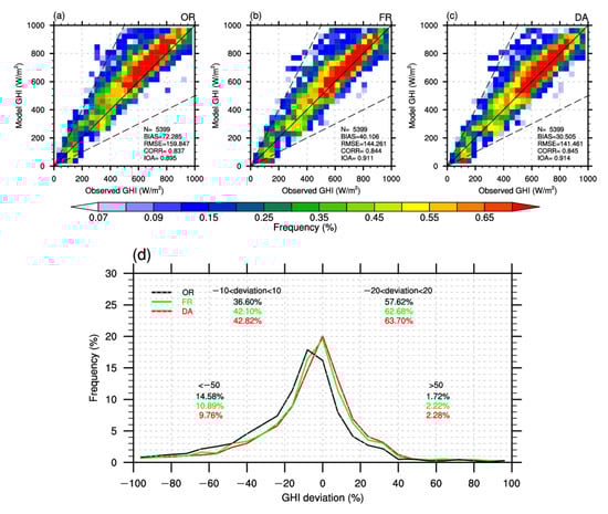 As shown in Figure 8, the probability density and PDF plots of the observed hourly GHI versus the simulated ones under clear skies for the three experiments are presented. Due to the lack of aerosols, GHI in the OR experiment is overestimated (Figure 8a), with BIAS beyond 72 W/m2 and RMSE beyond 159 W/m2. Apart from the minor improvement of CORR and IOA values, the BIAS and RMSE valves in the FR and DA experiments are all superior to the OR ones and present best performances in DA experiment (Figure 8b,c). Their relative improvements (compared with the OR experiment) are 44.52% and 61.95% for BIAS, 9.75%, and 11.50% for RMSE, separately. Compared to the OR experiment, the PDF distributions for the other two experiments all show reduced bias, as indicated by higher frequencies of deviations within 20 (Figure 8d). Meanwhile, the weak negative biases of the OR experiment are improved by the experiments online coupled with chemistry, leading to peaks closer to 0. We also find that the DA is more efficient in correcting overly underestimated GHI with departures less than −50 W/m2, which is related to the better performance of AODs DA with departures greater than 0.5 in Figure 7b. All in all, 38.61% of stations have significant improvements (both for RMSE and CORR values), 59.51% of stations have lower RMSE values, and 53.46% of stations have higher CORR values in rural and suburban areas.
