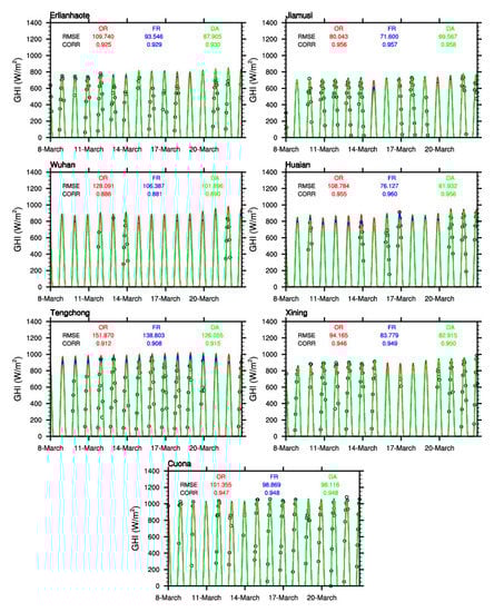 Then seven typical rural and suburban stations from the main seven electricity regions are picked out, their information is given in Table 4, and their time series of the observed and simulated hourly GHI under clear skies are shown in Figure 9. Apparently, GHI in OR and FR experiments tend to overestimate the daily high values in most stations, especially in Huaian and Tengchong stations. After DA, the simulated GHI values are closer to the observed ones, and the overestimation trends are corrected. Huaian station shares the best corrections, the RMSE value decreases by 43.07% in the DA experiment compared with the OR one. Overall, DA help to reproduce better variations from hours to days.