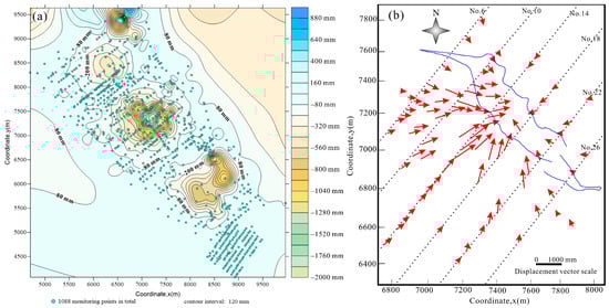 Characteristics of vertical and horizontal displacement at the Jinchuan Nickel Mine: (a) Distribution of GPS monitoring points at Jinchuan Nickel Mine overlying a contour map of the vertical displacements recorded for October 2015, using May 2005 as a baseline. (b) Diagram of horizontal displacement vectors at mine field No.2 in October 2015, using May 2001 as a reference measure.