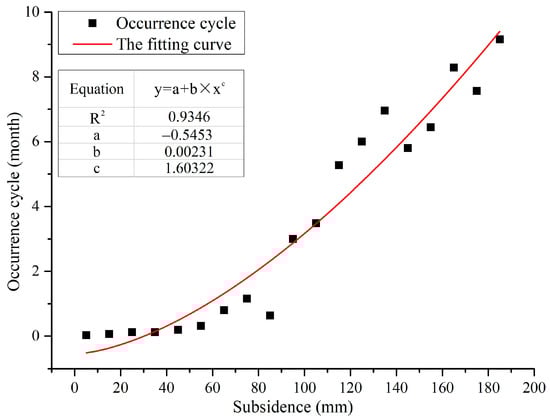 Figure 4 shows the statistical results of the subsidence value and the occurrence cycle. It can be seen that the small-scale subsidence had a short period and high frequency, while the large-scale subsidence volume had a long period and low frequency. According to the fitting results, there was a power-law relationship between the amount of subsidence and its occurrence cycle.