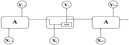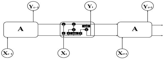 Traditional neural networks (NN) include an input layer, hidden layers, and output layer. These layers are fully connected, but the nodes between each layer are independent. Therefore, it is difficult to deal with time sequence issues by using NN. As shown in Figure 2, a recurrent neural network (RNN) is composed of repeated NN modules in a chain form, in which A represents a unit, Xt is the input at time t, and Yt is the corresponding output through the unit and is used as another input factor for the next unit at time t+1 for information transmission. Therefore, the nodes between the hidden layers are connected and the information is transmitted.