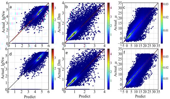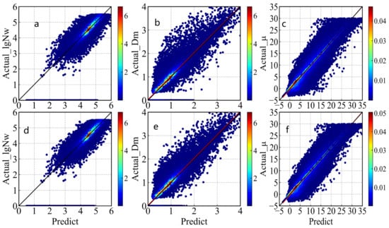 The 30-min scatter plot of lgNw, Dm, and μ fitted by the observed data and predicted by the model, in which (a–c) are modeled with MLF and (d–f) with SLF. The red line denotes a linear trend line of the scattered points, and the color mark represents the Gaussian kernel density estimation.