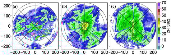 The 0.5° PPI of reflectivity of the Hefei radar at 0436 (a), 0522 (b), and 0528 LST (c) on 29 June 2015, in which the red triangle is the location of the disdrometer at Dingyuan.