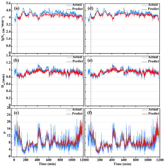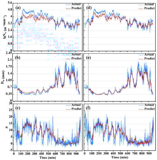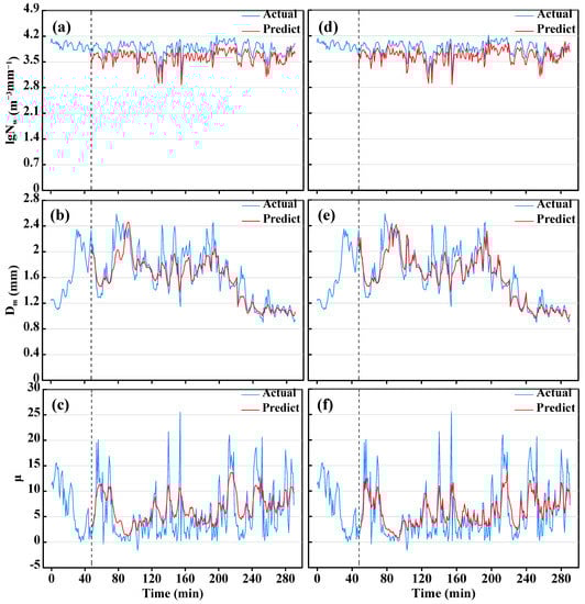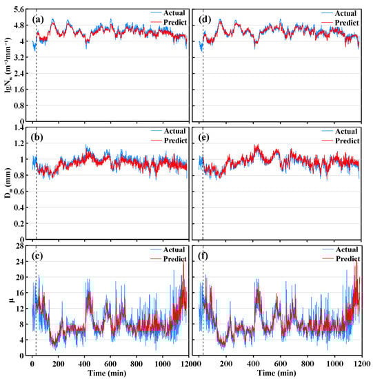 The curve of the 30-min prediction for the convective cloud precipitation case, in which the horizontal axes are rainfall duration time (min); vertical axes are (a,d) lgNw, (b,e) Dm (mm), and (c,f) μ; the red and blue curves represent the predicted and actual values; and the vertical dotted line is at the minute of Tstep + Mpred. Modeling with MLF is shown on the left (a–c), and with SLF on the right (d–f). Results of 30-min Prediction.
