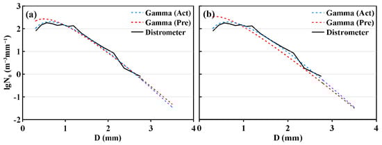 where the maximum Nw, Dm, and μ were set to 105.5 m−3 mm−1, 4 mm, 30, and the minimum of Nw and Dm were set to 0, while μ was set to −5, respectively. If the values of the fitting parameters of the normalized Gamma were larger than the maximum or less than the minimum, their values were set to the corresponding maximum or minimum.