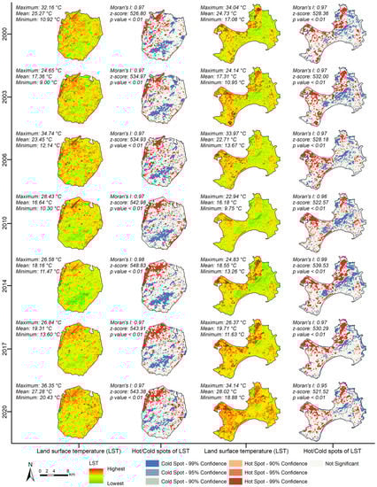 According to the positive Moran’s I, which ranged from 0.95 to 0.99 at the 0.01 significance level, significant spatial cluster patterns of LST existed in both Xiamen Island and Kinmen Island in all periods, whose geographical spatial distribution was characterized by the cold/hot spot area as shown in Figure 2. From 2000 to 2020, the area proportion of hot spot regions (with a confidence level of 0.9 or above) of LST increased in both islands, and 5.06% and 5.78% of the spatiotemporal stable hot spot regions were retrieved in Xiamen Island and Kinmen Island, respectively, which may provide supplementary information for the identification of the small regional-scale UHI.