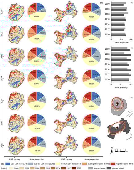 The spatiotemporal change and comparison of STE between Xiamen Island and Kinmen Island from 2000 to 2020. (a) The distribution and area proportion of LST zoning; (b) Heat amplitude change; (c) Heat intensity change; (d) Geographical distribution (mean center and directional distribution ellipse) change in HTZ.