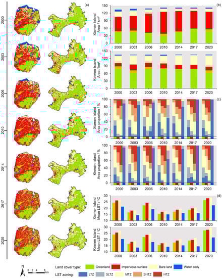 Spatiotemporal change in land cover and their effects on LST in the two islands from 2000 to 2020. (a) Identification results of land cover; (b) Change in the area of land cover types; (c) Area proportion of LST zones over different land cover types; (d) Comparison of mean LST over different land cover types.
