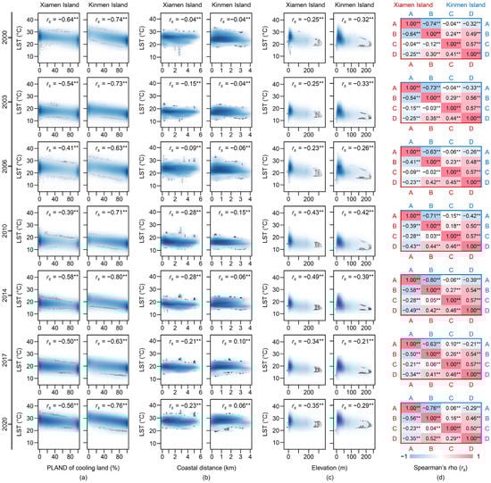 Correlation between LST and its impact factors in the two islands from 2000 to 2020. (a) The effect of PLAND of cooling land on LST (the opposite trend for PLAND of warming land); (b) The effect of coastal distance on LST; (c) The effect of elevation on LST; (d) Thermal map of Spearman’s rho among variables (A: LST; B: PLAND of cooling land; C: coastal distance; D: elevation). ** at the 1% significance level.