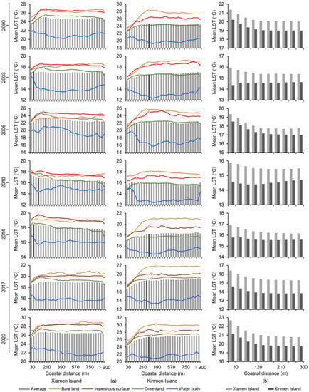 In view of the opposite partial correlation analysis results of the two islands, we calculated the mean LST in different coastal distance regions with the basic distance unit of 30 m to further explore the influence of the marine environment on LST of these two inhabited islands. Considering the strong influence of the land cover type on LST proved above, both classified statistics according to land cover and comprehensive statistics were carried out, and the results are shown in Figure 6a.