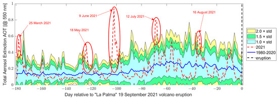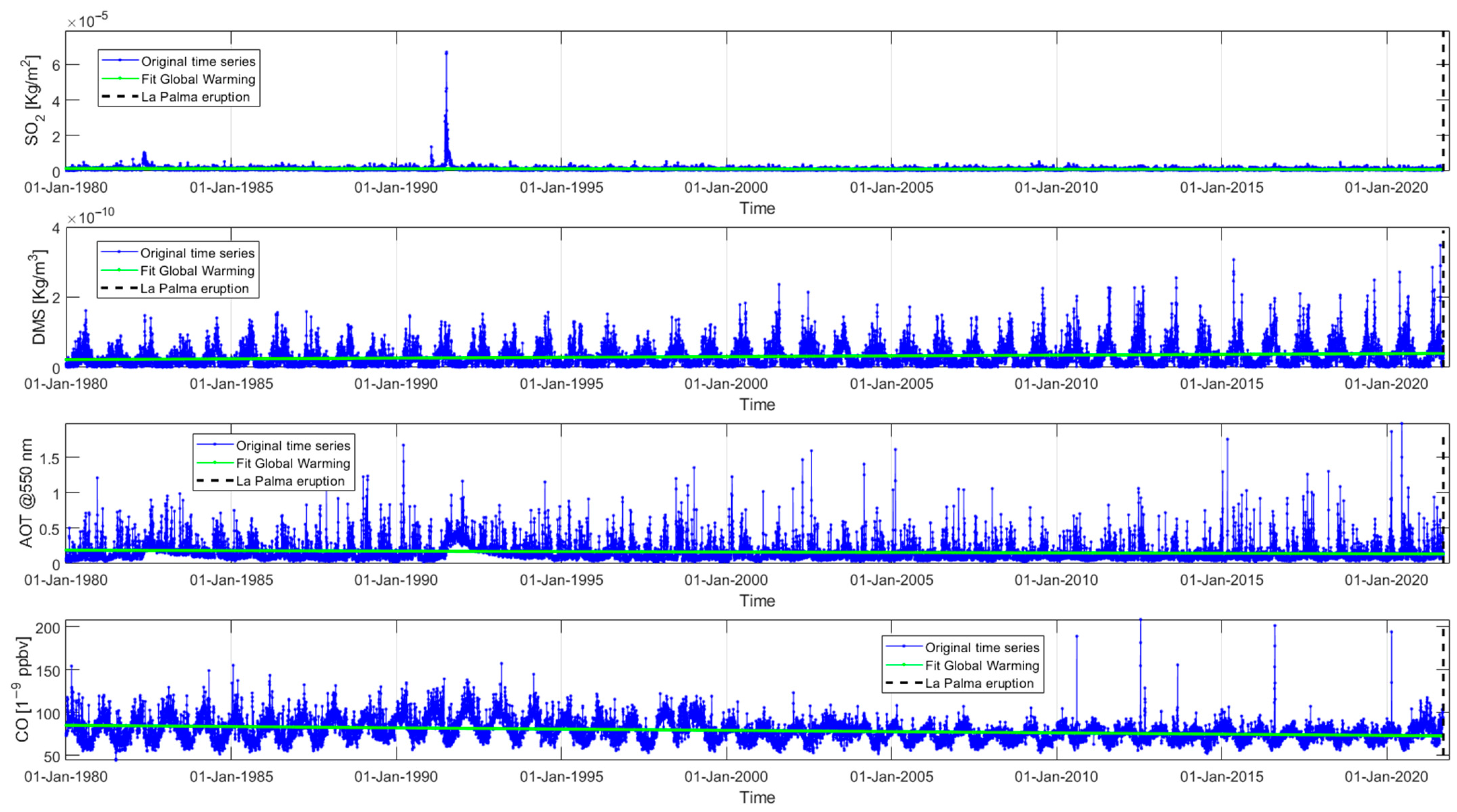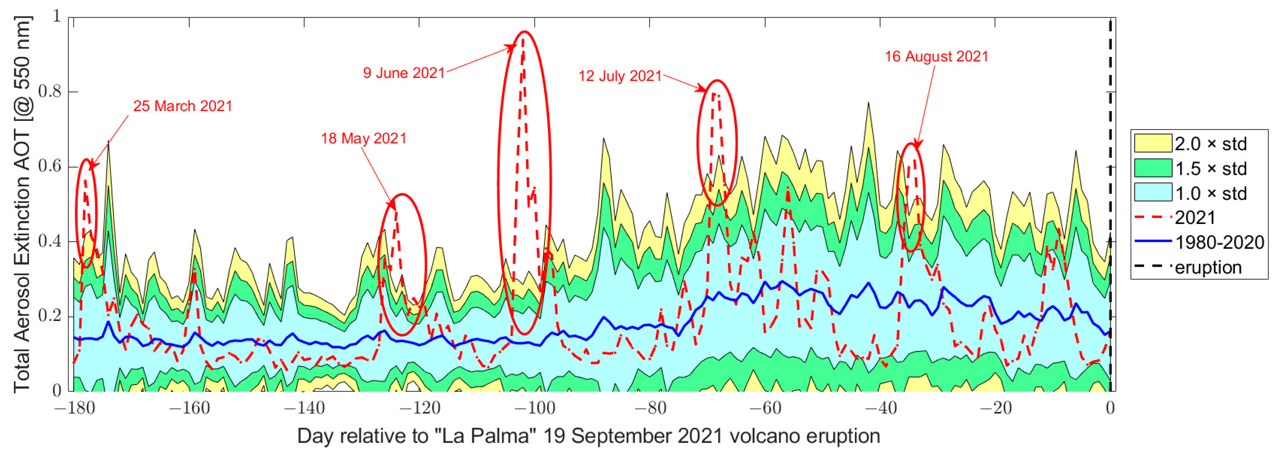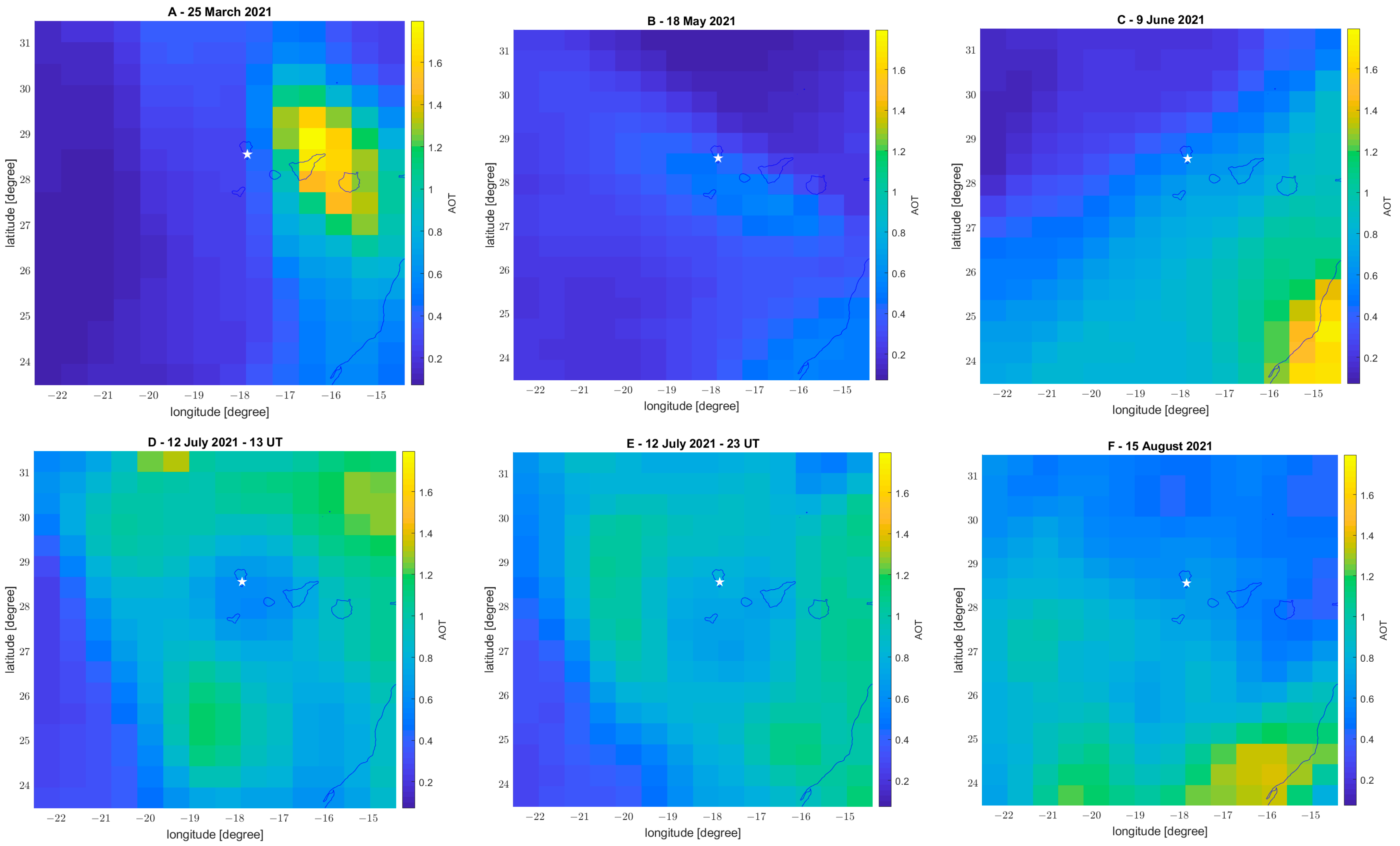| Aerosol | 25 March | 103.88% | Spatially coincide with the caldera of the Canarias volcano system |