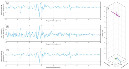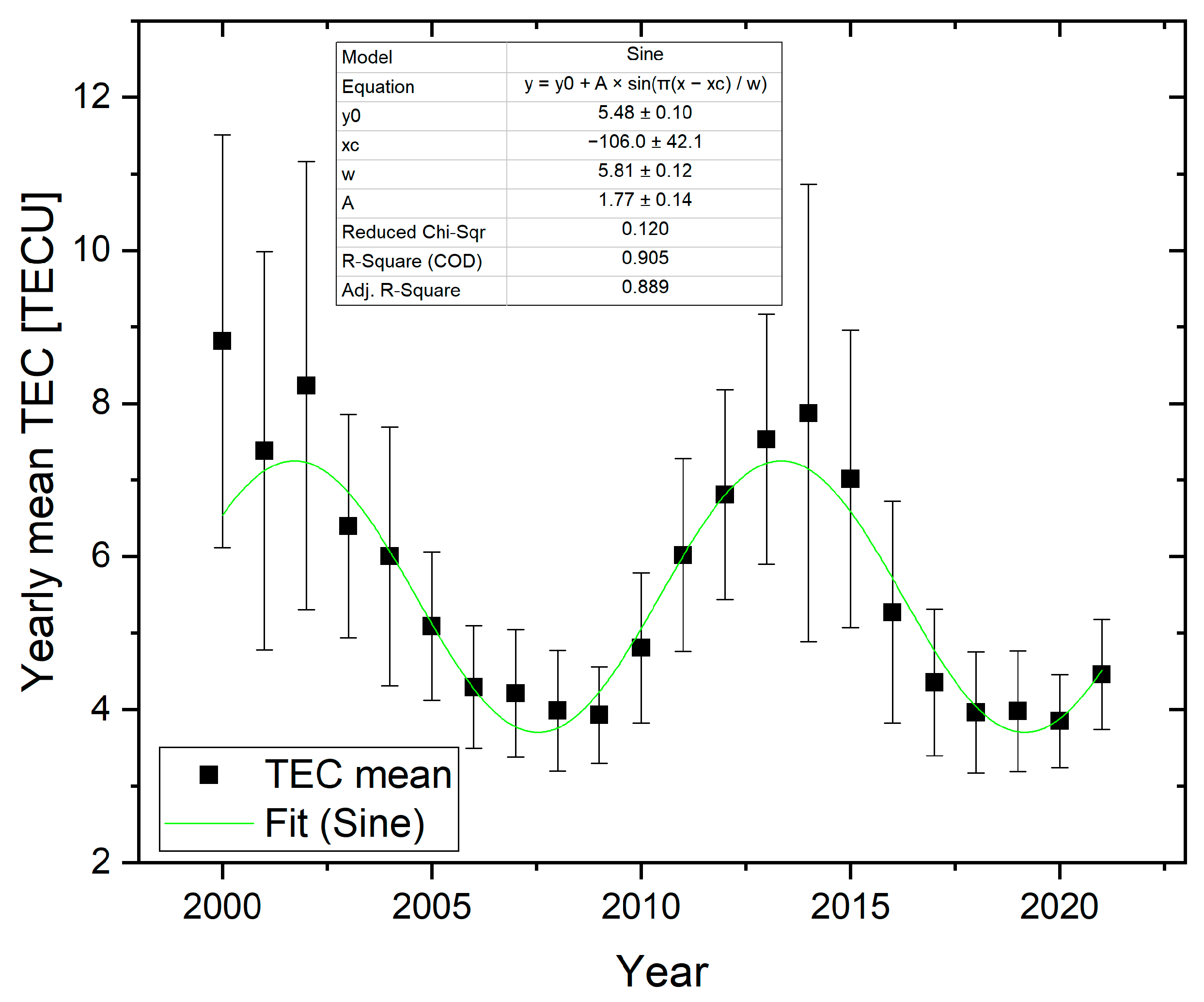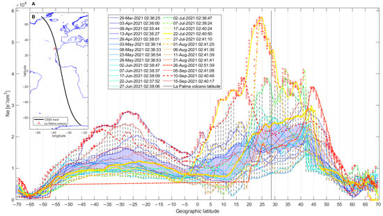 - The geomagnetic latitude of each sample was computed considering the position of the magnetic pole provided by the IGRF-13 geomagnetic model [96], and the samples outside the range [−50, +50] of geomagnetic latitude were rejected.