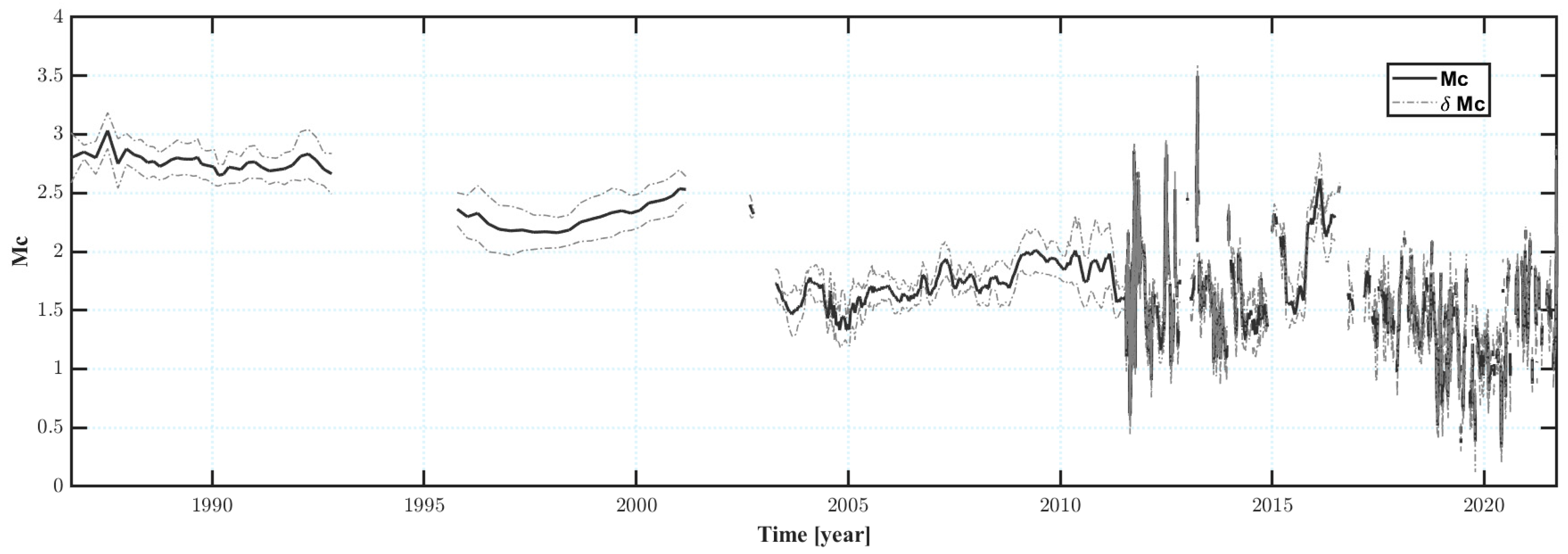 - Marchetti, D.; De Santis, A.; Campuzano, S.A.; Zhu, K.; Soldani, M.; D’Arcangelo, S.; Orlando, M.; Wang, T.; Cianchini, G.; Di Mauro, D.; et al. Worldwide Statistical Correlation of Eight Years of Swarm Satellite Data with M5.5+ Earthquakes: New Hints about the Preseismic Phenomena from Space. Remote Sens. 2022, 14, 2649. [Google Scholar] [CrossRef]