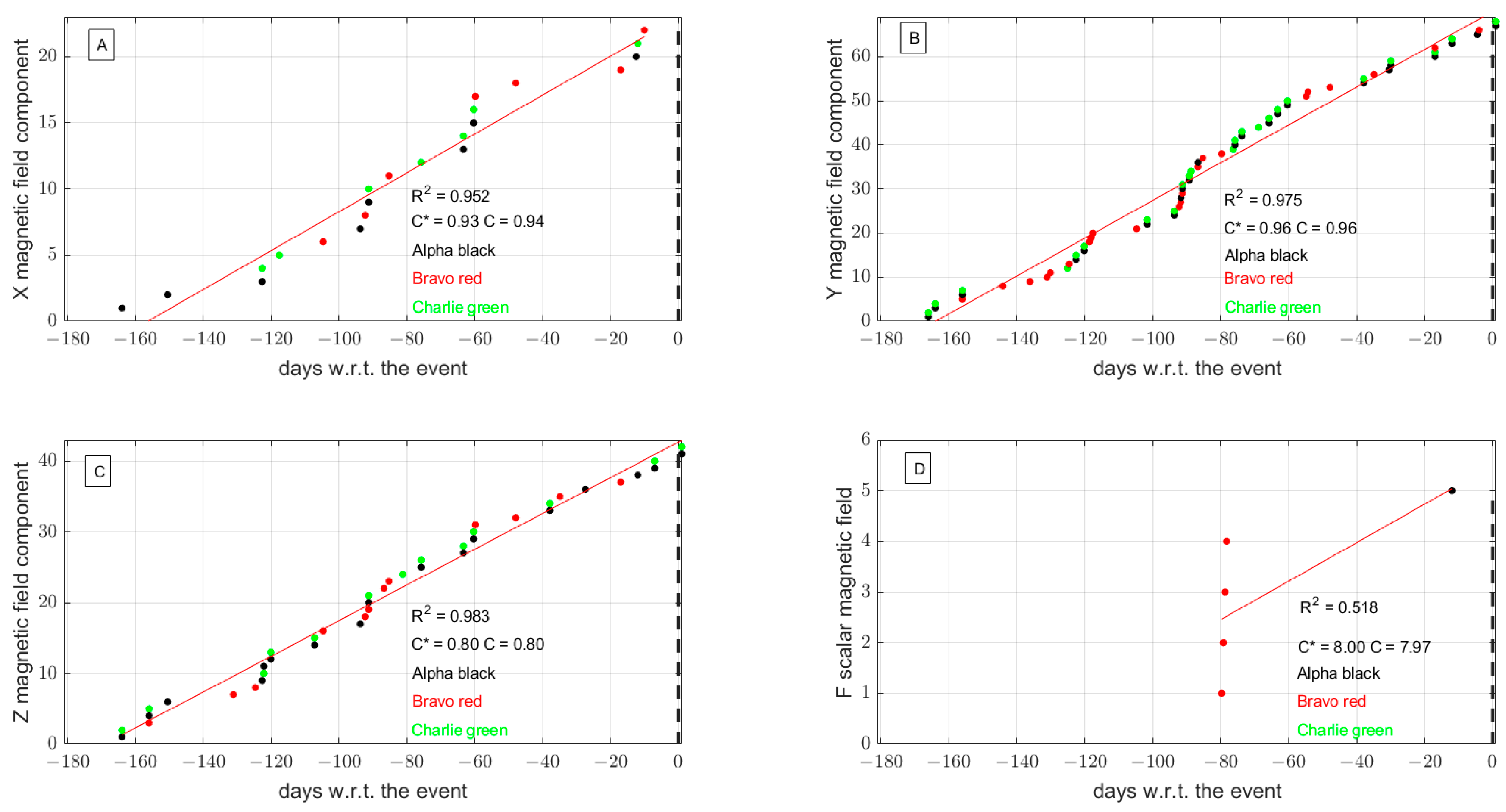 - The cumulative curve of all the identified anomalous tracks was computed for each component of the geomagnetic field, combining the three satellites together.